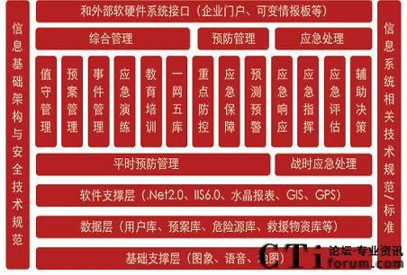 突發(fā)公共事件應(yīng)急管理系統(tǒng)包括電話自動接處呼叫系統(tǒng)、指揮調(diào)度系統(tǒng),數(shù)字錄音系統(tǒng),地理信息系統(tǒng)、預(yù)測預(yù)警系統(tǒng),決策支持系統(tǒng)等。