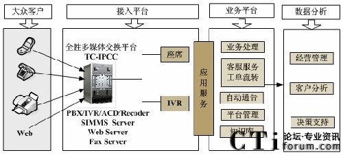 隨著呼叫中心技術(shù)的發(fā)展,傳統(tǒng)的語(yǔ)音通話已不能滿足日益增長(zhǎng)的業(yè)務(wù)需求,TC-IPCC平臺(tái)整合了視頻Video、文本Text、電子郵件Email、短消息SMS、互聯(lián)網(wǎng)Web以及3G等多媒體通訊方式。高效、統(tǒng)一的把各種媒體渠道融合在一起,并極大地拓展了聯(lián)絡(luò)中心業(yè)務(wù)應(yīng)用的類型和范圍。