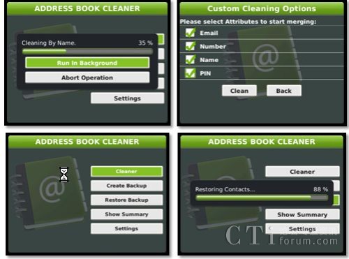 同事、同學、朋友、家人、客戶、合作伙伴…你的黑莓手機中存了多少聯(lián)系人了?其中又是否有重復存儲呢?一款名為Address Book Cleaner應用,可以幫助你整理和合并黑莓手機中的重復聯(lián)系人信息。該應用可設置按照重復姓名、號碼、電子郵件地址、PIN碼等進行查重、合并和刪除,并可在整理結(jié)束后給出整理報告。同時,Address Book Cleaner還可以隨時隨地將通訊薄中的聯(lián)系人信息進行備份和恢復,可讓用戶在無法與PC的BlackBerry Desktop Manager連接的時候,也可以輕松進行聯(lián)系人的備份和恢復操作。