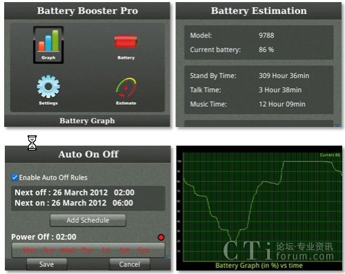 安裝了這么多應用,很多同學會考慮我的電池還能hold的住嗎?此次,特別為大家介紹一款名為Battery Booster Pro的手機電量管理應用,它可以通過自身具備的五大功能很好的幫用戶管理黑莓手機電量:1. 規(guī)則制定:用戶可以通過它為黑莓手機中的應用設定監(jiān)測規(guī)則,一旦用戶忘記關閉某應用,Battery Booster Pro就會跳出警告標志; 2. 自動開/關手機:用戶可以為自己的手機設定自動開關時間,以節(jié)省不必要得電量消耗;3. 電量提醒,當電量低于一定的百分比后,該應用就會自動提示用戶;4. 電量追蹤,Battery Booster Pro還可以通過直觀的圖表顯示出設備一天內(nèi)的電量消耗狀況;5. 電量預測,該應用還可以預測出手機所剩的電量在待機、聽音樂和電話等情況下的工作時長。