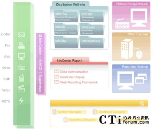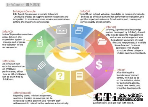 由于今日的客服中心已是多媒體的客服中心,不再只有單純的電話(huà)進(jìn)線(xiàn),客戶(hù)尋求服務(wù)的管道更多樣化,InfoCenter Total Solution可以完全整合應(yīng)用程序、數(shù)據(jù)倉(cāng)儲(chǔ)系統(tǒng)、多媒體溝通互動(dòng)管道,藉由不同的系統(tǒng)達(dá)到分析與處理客戶(hù)需求,并且達(dá)到一致性的工作流程管理,提供更高質(zhì)量的服務(wù)。