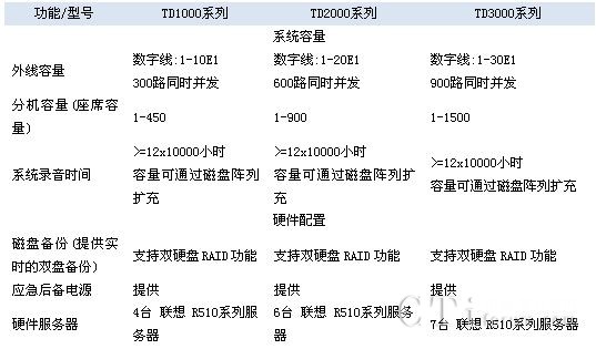 TD3000系列產(chǎn)品,設(shè)計(jì)容量為30E1外線(900路并發(fā)),1500座席。TD3000系列在2000系列的技術(shù)上,增加1臺應(yīng)用服務(wù)器,以響應(yīng)更多的座席業(yè)務(wù)處理的請求。