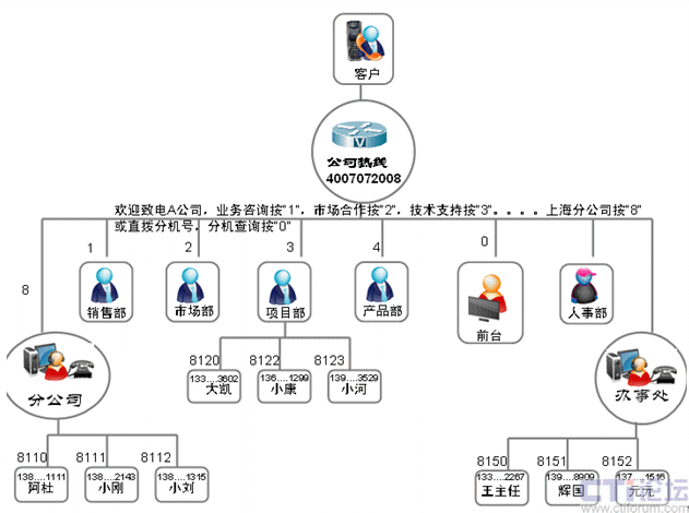 一直以來,呼叫中心座席的形式比較固定,大都通過長(zhǎng)期坐在辦公室的人員使用PC機(jī)和電話機(jī)結(jié)合的方式進(jìn)行工作。但是,這種形式顯然不能滿足中小企業(yè)運(yùn)營(yíng)管理的需要,在以銷售為重的中小企業(yè)中大部分人員并不完全坐在辦公室工作,如客戶經(jīng)理、客戶服務(wù)工程師,即使坐在辦公室,也不會(huì)一直在等著接電話,如開發(fā)工程師、生產(chǎn)車間的人員等等。如何既要滿足企業(yè)運(yùn)營(yíng)的需要,又要實(shí)現(xiàn)呼叫的管理和分配呢?我們只需要將座席的形式簡(jiǎn)化,將呼叫分配的目標(biāo)擴(kuò)大就可以了。手機(jī)是目前最常見和普遍的通信工具,只要我們將手機(jī)做為座席進(jìn)行管理,既不改變現(xiàn)有的組織架構(gòu),又能充分利用呼叫分配工作并對(duì)工作人員進(jìn)行管理,這將大大提高中小企業(yè)運(yùn)營(yíng)管理的靈活性和變通性。企業(yè)組織架構(gòu)如下: