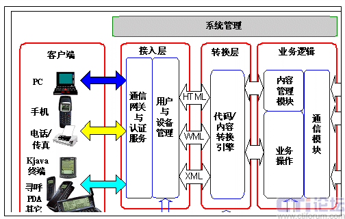 系統(tǒng)支持多種接入設(shè)備,包括廣泛使用的Web瀏覽器、支持WAP或HDML的移動電話、支持Kjava的移動終端、基于PalmOS或WinCE的PDA(個(gè)人數(shù)字助理)、傳統(tǒng)的移動電話和尋呼等,并可以方便對于未來的接入設(shè)備進(jìn)行定制。