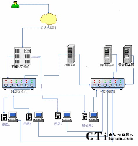 根據(jù)以上業(yè)務設計框架,我們確定了客服中心搭建時所需要的設備,系統(tǒng)的拓撲結構示意如下: