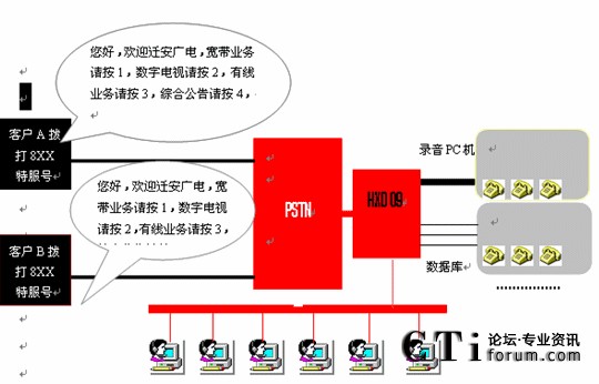 本系統(tǒng)物理結(jié)構(gòu)HXD交換機(jī)、CTI服務(wù)器、IVR(交互式語音應(yīng)答)/IFR(交互式傳真應(yīng)答)服務(wù)器、業(yè)務(wù)代表座席(邏輯上分為:普通業(yè)務(wù)代表座席、專家座席等)、班長座席、統(tǒng)計維護(hù)管理工作站、因特網(wǎng)(WEB)服務(wù)器、數(shù)據(jù)庫/應(yīng)用服務(wù)器、錄音工作站、網(wǎng)絡(luò)系統(tǒng)等構(gòu)成。