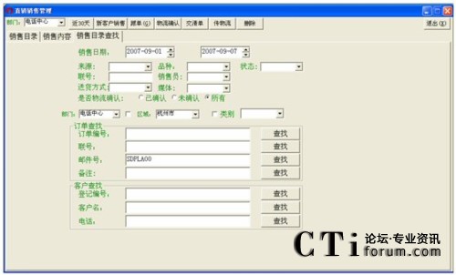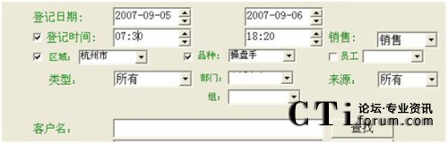 例子:查找2007年9月5日到2007年9月6日間,登記時(shí)間為早上7:30到晚上18:20,購(gòu)買(mǎi)了操盤(pán)手軟件的杭州市顧客的查找設(shè)置如下: