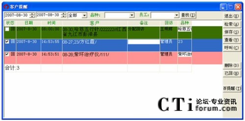 對(duì)于已經(jīng)回訪過(guò)的提醒,選定它并單擊已回,這樣它的狀態(tài)就會(huì)標(biāo)記為已回,再單擊一下查找,則剛才設(shè)定為已回的提醒,記錄的顏色變?yōu)榉奂t。