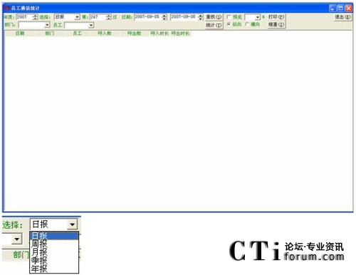 在員工通話統(tǒng)計(jì)中,從選擇欄中可以選擇日?qǐng)?bào)、周報(bào)、月報(bào)、季報(bào)、年報(bào)這五種統(tǒng)計(jì)方式,分別統(tǒng)計(jì)當(dāng)天、當(dāng)周、當(dāng)月、當(dāng)季、當(dāng)年的員工的通話信息(呼入電話的個(gè)數(shù)、呼出電話的個(gè)數(shù)、呼入通話的時(shí)長(zhǎng)、呼出通話的時(shí)長(zhǎng))。