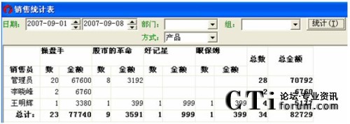 統(tǒng)計(jì)方式中含5種查詢方式:時(shí)間段、員工、產(chǎn)品、銷(xiāo)售、區(qū)域,可按這幾種方式進(jìn)行進(jìn)線銷(xiāo)售統(tǒng)計(jì)。