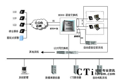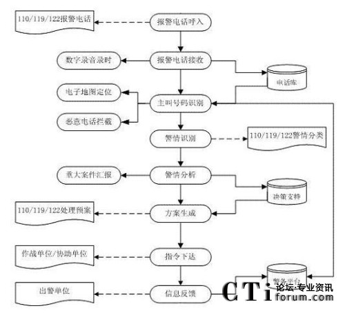 該系統(tǒng)主要分為電信子系統(tǒng)(完成聯(lián)動中心與各電信公司之間話音的傳輸、交換和分配,以及主叫號碼和主叫地址的自動查詢和傳輸?shù)龋、接警中心子系統(tǒng)(統(tǒng)一接聽和處理市民的報警、求助電話)、指揮調(diào)度子系統(tǒng)(或稱為處警中心,通過直觀的地理信息系統(tǒng)和數(shù)據(jù)庫,可以對所有的資源和警力分布了如指掌。通過一體化的無線數(shù)據(jù)傳輸和無線調(diào)度臺進行方便的統(tǒng)一管理,指揮和調(diào)度)、信息網(wǎng)絡(luò)子系統(tǒng)(聯(lián)動中心的骨干網(wǎng)絡(luò),把各種數(shù)據(jù)數(shù)庫、接處警席位、移動的警用車載計算機等互聯(lián)在一起,形成一個強大的信息網(wǎng)絡(luò))、無線指揮調(diào)度通信子系統(tǒng)、大屏幕顯示子系統(tǒng)、地理信息子系統(tǒng)、GPS/GIS子系統(tǒng)。