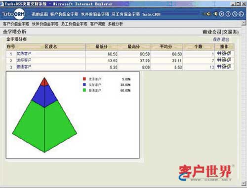 根據(jù)預(yù)先設(shè)定的客戶價(jià)值評估模型,CRM會自動計(jì)算出每個(gè)客戶的價(jià)值得分以及對應(yīng)到不同等級的客戶價(jià)值,并會記錄到客戶項(xiàng)下,便于業(yè)務(wù)人員在與客戶接觸時(shí),直觀了解客戶價(jià)值情況?蛻魞r(jià)值金字塔分析(如圖),可以動態(tài)的了解各類客戶的價(jià)值分布。