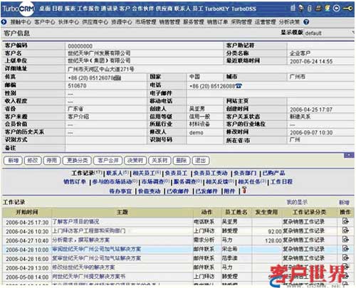 信息整合是CRM系統(tǒng)實(shí)現(xiàn)對客戶信息進(jìn)行管理的基礎(chǔ),將客戶的各類信息進(jìn)行關(guān)聯(lián),當(dāng)查詢某個(gè)客戶時(shí),與該客戶相關(guān)的歷史接觸記錄、交易記錄都可一目了然地展現(xiàn)出來,也可以方便地進(jìn)行相關(guān)信息的及時(shí)錄入。(如下圖)