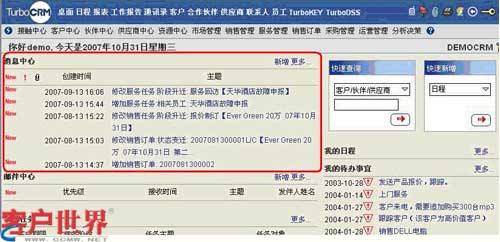 TurboCRM系統(tǒng)的消息中心是協(xié)同工作的核心,當(dāng)客戶接觸過程有進(jìn)展時(shí),相關(guān)員工的桌面會出現(xiàn)消息提醒,以方便員工及時(shí)地了解客戶動態(tài)。