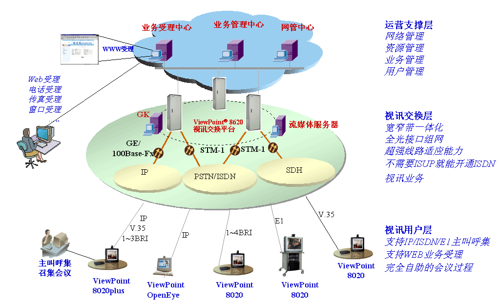 “視點(diǎn)通”ViewPoint®8000綜合視訊系統(tǒng)可以充分利用現(xiàn)有網(wǎng)絡(luò)資源,為網(wǎng)絡(luò)運(yùn)營(yíng)商提供完善的訊業(yè)務(wù)運(yùn)營(yíng)解決方案,使得視訊業(yè)務(wù)真正能夠廣泛服務(wù)于遠(yuǎn)程教學(xué)、企業(yè)會(huì)商、遠(yuǎn)程醫(yī)療、應(yīng)急通信、行政會(huì)議等領(lǐng)域,并逐步進(jìn)入千家萬(wàn)戶。