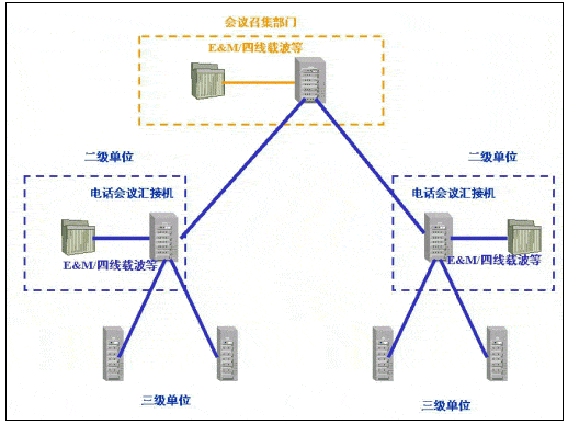當(dāng)前國內(nèi)許多行業(yè)由于行業(yè)的業(yè)務(wù)特點,在原有的電話網(wǎng)應(yīng)用中,電話會議作為常用的交流手段發(fā)揮著重要作用。這些行業(yè)的電話會議業(yè)務(wù),主要是通過電話會議匯接機的方式實現(xiàn):會議召集單位通過電話會議匯接機(以下簡稱匯接機)通過專線、撥號等方式連通下級單位(以下簡稱二級單位)的匯接機,二級單位的匯接機通過專線、撥號等方式連通所轄單位(以下簡稱三級單位)的會場電話。這樣通過多級匯接機級連的方式實現(xiàn),主持單位和二、三級單位間的電話網(wǎng)連通,利用匯接機實現(xiàn)廣播、三方通話、調(diào)度發(fā)言單位等會議功能。