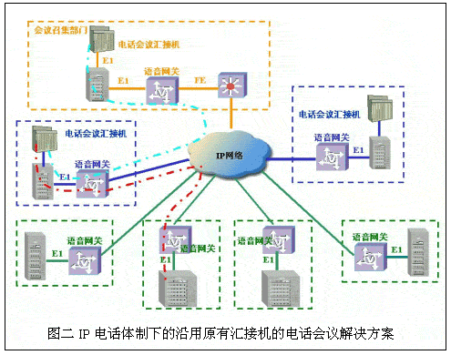 伴隨著IP網(wǎng)的建設(shè)和VoIP電話系統(tǒng)標準的日益完善,許多行業(yè)、部門開始在建設(shè)IP數(shù)據(jù)網(wǎng)的同時,結(jié)合原有電話專網(wǎng)的改造,著手建設(shè)IP電話網(wǎng)絡(luò)。在IP電話網(wǎng)上實現(xiàn)原有的電話會議業(yè)務(wù)也就隨之提到日程上來。華為公司結(jié)合IP電話的特點和保護用戶已有投資的角度,提出延用電話會議匯接機和采用華為專用IP電話會議控制系統(tǒng)兩套解決方案: