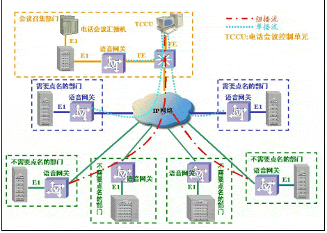 采用原有的會議電話架構(gòu),只是話音的長途連接由模擬專線等改為IP傳輸。方案由于采用原有電話會議匯接機,保護了用戶的原有投資。缺點是在召開多級會議電話時,由于語音信號首先在召集單位語音網(wǎng)關(guān)進行壓縮,經(jīng)IP傳輸后,在二級單位語音網(wǎng)關(guān)解壓縮還原為模擬話音,再經(jīng)二級單位的語音網(wǎng)關(guān)二次壓縮,經(jīng)IP網(wǎng)傳輸后,在三級單位的語音網(wǎng)關(guān)上二次解壓縮,導(dǎo)致語音信號多次壓縮/還原,對語音質(zhì)量損傷較大。
