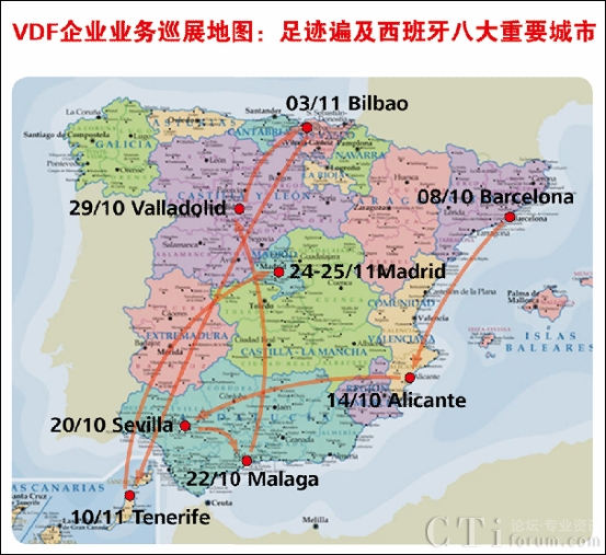 Vodafone 09企業(yè)業(yè)務巡展是Vodafone攜手10家重要合作伙伴和28家SP針對西班牙企業(yè)用戶舉行的一個大型巡展,整個展會歷時兩個月,以西班牙的經(jīng)濟文化中心Barcelona為起點,途徑Alicante、Sevilla、Malaga、Valladolid、Bilbao、Tenerife,最后于11月24-25號在西班牙首府Madrid隆重謝幕。共有1萬多人、五千多家企業(yè)參加了本次展會,受邀企業(yè)覆蓋到金融、貿(mào)易、電信、交通、建筑、服務、醫(yī)療保健等重要行業(yè),其中大都為移動辦公需求旺盛需要保持實時協(xié)同的中小型企業(yè)。展會期間,華為歐洲地區(qū)部多位高層領導親臨展會現(xiàn)場指導工作,包括Vodafone系統(tǒng)部副總Edward Chan和張文林、代表處代表謝新平、歐洲軟件業(yè)務部領導林劼。領導們和客戶親切交流,并廣泛了解了其他SP展出的多項創(chuàng)新業(yè)務。