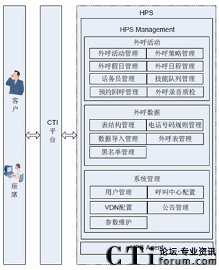 Server)提取HPS Management中導(dǎo)入的客戶數(shù)據(jù),自動批量的執(zhí)行外呼任務(wù)?蛻艉敉ê,簽入HPS Agent 的話務(wù)員為客戶提供語音服務(wù)。