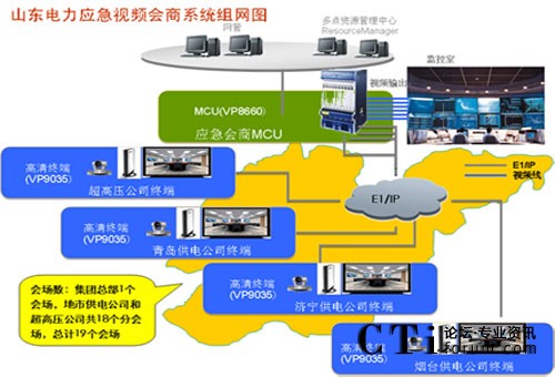 山東電力集團(tuán)公司為了開展應(yīng)急視頻會(huì)商業(yè)務(wù),需建設(shè)一套覆蓋集團(tuán)總部、地市供電公司、超高壓公司等19個(gè)單位的視訊系統(tǒng),并能夠與國(guó)家電網(wǎng)、地市供電公司已有系統(tǒng)實(shí)現(xiàn)音、視頻的互通。