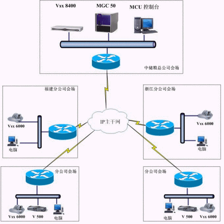 中心MCU采用美國POLYCOM公司 MGC-50多點(diǎn)控制單元,安裝在中儲(chǔ)糧北京總公司的中心機(jī)房。北京總公司主會(huì)場(chǎng)安放POLYCOM VSX
