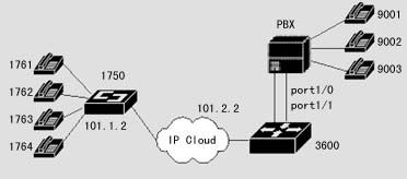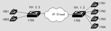 在該案例中,異地之間通過(guò)兩臺(tái)DCR 1750互連,并提供語(yǔ)音模塊,可直接接電話機(jī),使得異地之間可以通過(guò)IP網(wǎng)絡(luò)撥打IP語(yǔ)音電話。