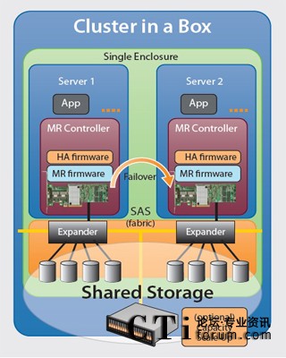 SAS 控制器對每個(gè)主板實(shí)現(xiàn)集群化,同時(shí)為兩部服務(wù)器提供冗余存儲連接功能。