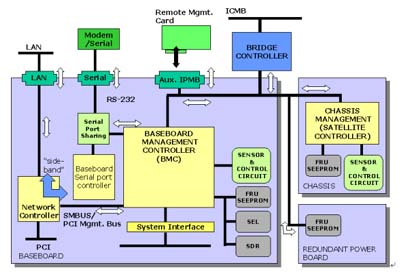 Controller (BMC)。它通過各別的界面來管理整個系統(tǒng),如系統(tǒng)狀態(tài)偵測及事件過濾、電源管理、記錄事件發(fā)生時間及系統(tǒng)回復控制,并且透過網絡或串行端口來告知管理人員,另外,它提供了IPMB的總線來和外部的管理控制器互相溝通。