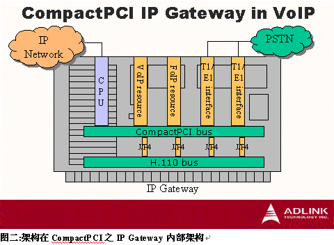 如何實(shí)現(xiàn)如此多功能的IP Gateway如圖二架構(gòu),在CompactPCI標(biāo)準(zhǔn)的背板上,整合了計(jì)算機(jī)電話領(lǐng)域常用的標(biāo)準(zhǔn)H.110 bus,提供冗余時(shí)鐘支持熱插拔板卡如VoIP、FoIP、T1/E1