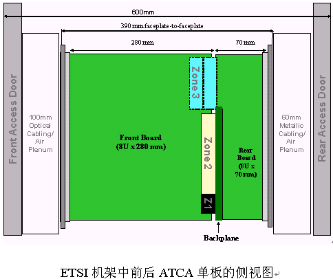 PICMG 3.0機構(gòu)要求主要來自于對600mm ETSI 和19" EIA標準機柜空間使用的研究。PICMG 3.0委員會在考慮單板尺寸能支持下一代元器件對物理和散熱的需求的同時,機箱空間能和板子能達到最大限度的配合和利用。最初的工作是基于歐規(guī)卡的標準,繼而又提升到支持低成本的片狀金屬架構(gòu)(簡單電訊封裝)。對后走線模塊的支持滿足了對后I/O應用的需求。在決定可以使用的單板空間時,也充分考慮了前、后板的進深范圍以供大量電纜束綁空間。經(jīng)過對不同規(guī)格尺寸的單板的優(yōu)點進行討論之后,PICMG 3.0組織統(tǒng)一規(guī)格如下:前板 8U x 280mm,進深1.2" pitch,選配后板8U x 70mm深;1.2" pitch,19" EIA機框可以支持14槽,而600mm ETSI的機框可以支持16槽。下圖所示為600mm ETSI機架中的ACTA前后單板的側(cè)視圖:
