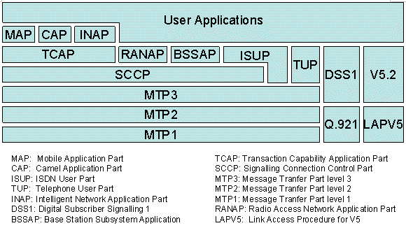 圖中MAP,CAP,RANAP,BSSAP為移動通信系統(tǒng)使用的信令;ISUP,TUP,INAP為固定網(wǎng)使用的信令;DSS1和V5.2為接入網(wǎng)使用的信令。