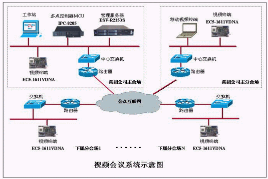 整個(gè)視頻會(huì)議系統(tǒng)采用EC5-1611VDNA作為會(huì)議室型視頻終端及FSC-1713VNA作為多點(diǎn)會(huì)議服務(wù)器?梢栽O(shè)立一個(gè)或者多個(gè)中心,通過(guò)數(shù)字傳輸信道,星形級(jí)聯(lián)而成。