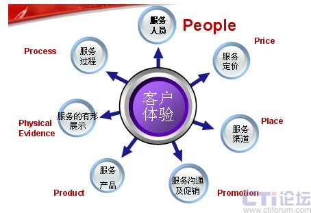 下面這張圖是服務(wù)營銷的7P模型,在這里我認(rèn)為最應(yīng)該關(guān)注的是People——人。這里,我想引用世界經(jīng)理人刊登的一篇文章“影響中國的十大管理理念”上的一段文字:“邁向服務(wù)型經(jīng)濟(jì)實(shí)際上就是邁向人才經(jīng)濟(jì)。在制造業(yè)中,價(jià)值是由機(jī)器創(chuàng)造的。在服務(wù)業(yè)中,價(jià)值則是人創(chuàng)造的!边@也是在服務(wù)業(yè)中,要將“人”進(jìn)行體現(xiàn)。也許你不在乎為你制造產(chǎn)品的工人長的美或丑,但為客戶服務(wù)的人員如果長的很丑,對服務(wù)就會(huì)有一定的影響。大家只看產(chǎn)品結(jié)果,不關(guān)注過程,但是服務(wù)卻是與過程緊密的結(jié)合。