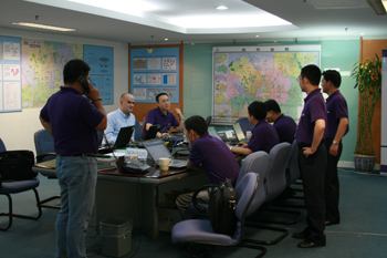 上海貝爾阿爾卡特工程師在公司設立在北京的奧運保障指揮部緊張工作