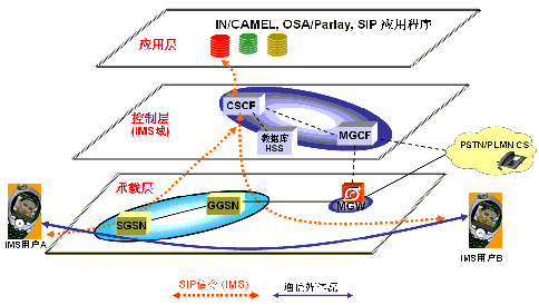 VPN等。圖中以移動(dòng)分組網(wǎng)的承載方式為例,描述了IMS用戶通過(guò)手機(jī)進(jìn)行IMS會(huì)話的方式,主要的承載層設(shè)備有SGSN、GGSN,以及媒體網(wǎng)關(guān)MGW。SGSN和GGSN可以完全重用現(xiàn)網(wǎng)設(shè)備,不需要硬件升級(jí),僅通過(guò)做相關(guān)配置就可以支持IMS了。MGW是負(fù)責(zé)媒體流在IMS域和CS域互通的功能實(shí)體,主要解決話音互通問(wèn)題。無(wú)論具體采用哪一種接入方式,只要基于IP技術(shù),所有的IMS用戶信令就可以很好地傳送到控制層。