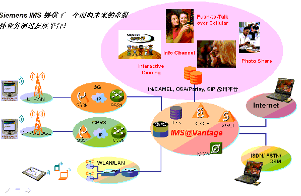 西門子IP多媒體子系統(tǒng)名為IMS@vantage,它完全遵循3GPP規(guī)范,提供了一個(gè)支持語(yǔ)音/多媒體數(shù)據(jù)業(yè)務(wù)集成的開(kāi)放式網(wǎng)絡(luò)控制平臺(tái),能為運(yùn)營(yíng)商以最經(jīng)濟(jì)快捷的方式提供多媒體應(yīng)用及開(kāi)發(fā)環(huán)境。