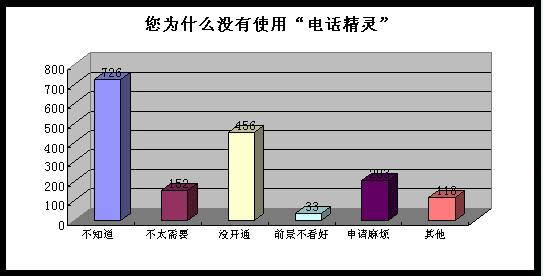 尚有相當多地區(qū)沒有開通此類服務,用戶感到遺憾。在“您為什么沒有使用‘電話精靈’?”的統(tǒng)計結果中“當地沒有開通”是一項主要原因,有不少用戶都留言希望能將電話精靈業(yè)務在更廣泛地區(qū)應用。曾經使用過“電話精靈”,但后期由于運營商停止了此項業(yè)務而不再使用的用戶也深感遺憾。