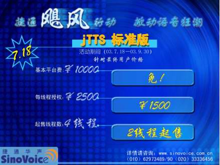 2003年7月18日,北京捷通華聲語(yǔ)音技術(shù)有限公司正式發(fā)布捷通華聲語(yǔ)音合成技術(shù) “jTTS標(biāo)準(zhǔn)版”。為慶!癹TTS標(biāo)準(zhǔn)版”的正式上市,為期近三個(gè)月,推廣“jTTS標(biāo)準(zhǔn)版”的捷通“颶風(fēng)行動(dòng)”也在同一時(shí)間正式啟動(dòng)! 捷通“颶風(fēng)行動(dòng)”的宗旨--用全新的產(chǎn)品、全方位的服務(wù)、最具競(jìng)爭(zhēng)力的價(jià)格與所有CTI領(lǐng)域的企業(yè)合作,開啟面向中小型CTI系統(tǒng)語(yǔ)音應(yīng)用的市場(chǎng)大門,為CTI產(chǎn)業(yè)發(fā)展提供持久動(dòng)力支持!