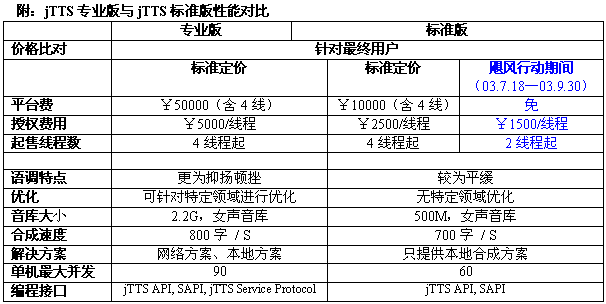 1)為"jTTS標(biāo)準(zhǔn)版"提供進(jìn)一步的優(yōu)惠價(jià)格。(詳情請(qǐng)聯(lián)系捷通市場(chǎng)營(yíng)銷中心)