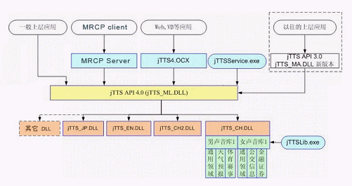 Programming Interface),即jTTS API 4.0,以及統(tǒng)一的多語(yǔ)種引擎管理模塊,即jTTS_ML.DLL。多語(yǔ)種的引擎(例如中文引擎jTTS_CH.DLL,英文引擎jTTS_EN.DLL等)在多語(yǔ)種引擎管理模塊的調(diào)度下進(jìn)行實(shí)際的合成工作,而目前尚未提供的其他語(yǔ)種的引擎也可以方便地加入到這個(gè)體系結(jié)構(gòu)中來(lái)。