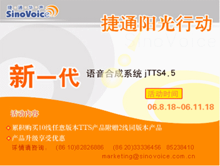 為慶祝jTTS4.5的上市,同時(shí)也為回饋廣大用戶,捷通華聲進(jìn)行為期三個(gè)月的推新品“陽光行動(dòng)”!詳情敬請瀏覽:http://www.sinovoice.com.cn/xwzx/20060818.htm