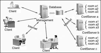 用戶可通過(guò)從56K撥號(hào)上網(wǎng)直至寬帶等各種方式接入該視頻會(huì)議系統(tǒng),包括PSTN撥號(hào)、ISDN撥號(hào)、ADSL撥號(hào)、LAN、PLC(低壓電力載波)等各種形式,在這個(gè)統(tǒng)一的視頻會(huì)議平臺(tái)上,實(shí)現(xiàn)多路音頻、多路視頻、文檔共享、電子白板、協(xié)同瀏覽、文件傳輸、文字交流等功能。系統(tǒng)的拓?fù)浣Y(jié)構(gòu)圖如左所示。