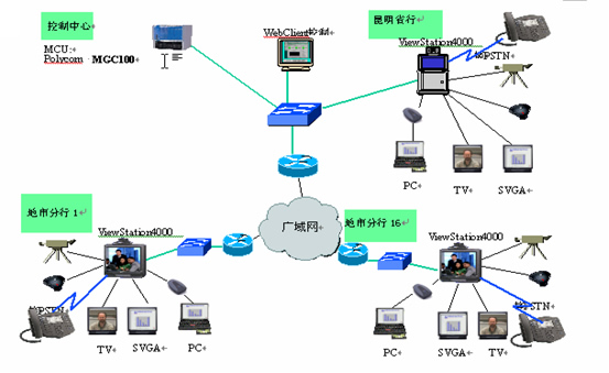 云南省中國銀行主會場放置1臺MGC-100 MCU和1臺視訊會議終端ViewStation4000,1套雙流模塊;其他16個地市各放置1臺視訊會議終端ViewStation4000,1套雙流模塊。MCU和視訊終端通過以太網(wǎng)交換機(jī)接入傳輸網(wǎng)絡(luò),根據(jù)各分地市網(wǎng)絡(luò)實際帶寬,視頻會議的帶寬定為2M。