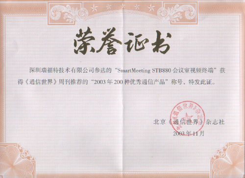 瑞福特視頻會議產品榮獲"2003年200種優(yōu)秀通信產品"稱號