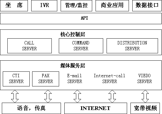 需要指出的是,由于ICSYS智能平臺系統(tǒng)采用了媒體服務(wù)層,上述所有Internet 呼叫事件都統(tǒng)一發(fā)送到系統(tǒng)核心層,所有呼叫的路由都由核心層Distribution Server來統(tǒng)一分配,從而保證了多種媒體的統(tǒng)一接入和統(tǒng)一排隊。三 商業(yè)應(yīng)用