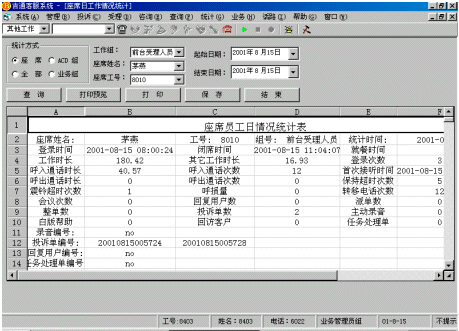 指定坐席的工作狀態(tài)(坐席工號、分機(jī)號碼、業(yè)務(wù)類型、忙閑狀態(tài)、通話時長等)