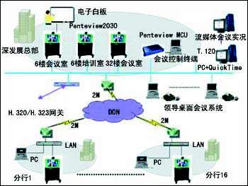 中太數(shù)據(jù)為深圳發(fā)展銀行構(gòu)建的視頻會議項目,是為深圳發(fā)展銀行在已有的DDN網(wǎng)絡(luò)的基礎(chǔ)上,構(gòu)建的一個全國性的會議電視平臺。通過這個平臺,使跨地域的溝通更加經(jīng)濟(jì)、高效和靈活。針對深發(fā)展的網(wǎng)絡(luò)實際情況以及會議電視的發(fā)展方向,方案中采用基于MPEG-4的Penteview2030產(chǎn)品,支持H.323的MCU Penteview 6182,以及Penteview數(shù)據(jù)會議服務(wù)器。整個深發(fā)展會議電視系統(tǒng)組網(wǎng)分為兩級,中心點3套Penteview 2030到下面的16個異地的分支行。深圳發(fā)展銀行大廈6樓大會議室、培訓(xùn)小會議室、32樓會議室作為主會議室,在6樓的機(jī)房中放置主MCU和一個終端,培訓(xùn)小會議室放置一個終端,其他16個異地分支行分別放置一臺Penteview2030終端,通過現(xiàn)有的深發(fā)展DDN網(wǎng)絡(luò)相互連通。根據(jù)深發(fā)展通信網(wǎng)絡(luò)結(jié)構(gòu)及傳輸容量的實際情況,該系統(tǒng)采用星型拓?fù)溥B接,各地可通過現(xiàn)有的DDN劃出768k-2M的帶寬,以視頻會議的方式組建起多點會議電視系統(tǒng)。各會場通過PC機(jī)實現(xiàn)數(shù)據(jù)會議功能。
