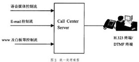 目前,IP Call Center實(shí)現(xiàn)綜合媒體統(tǒng)一處理的方式已取得比較一致觀點(diǎn),即如圖3的語(yǔ)音媒體流和IP傳真、Web主頁(yè)、Email進(jìn)入座席群前先經(jīng)過一個(gè)服務(wù)軟件進(jìn)行統(tǒng)一處理,該服務(wù)軟件一般廠家都稱為Call Center Server(簡(jiǎn)稱CCS服務(wù)器),它起著完成呼叫控制、路由處理、與呼叫同步的用戶數(shù)據(jù)管理及信息監(jiān)視等作用。