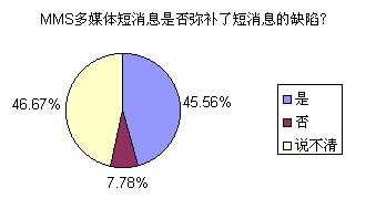 問卷的調(diào)查結果有些屬于意料之中,有些則暫一定程度上給運營商和終端提供上潑了冷水。不過,有一點是讓提供移動服務的企業(yè)感到欣慰和滿意的,那就是:最終用戶對MMS的接受程度相當高,除去對資費、操作的質(zhì)疑外,幾乎90%以上的用戶都認為MMS廣泛流行是一個必然的趨勢。下面我們就讀者們廣泛關注的問題來研究一下。